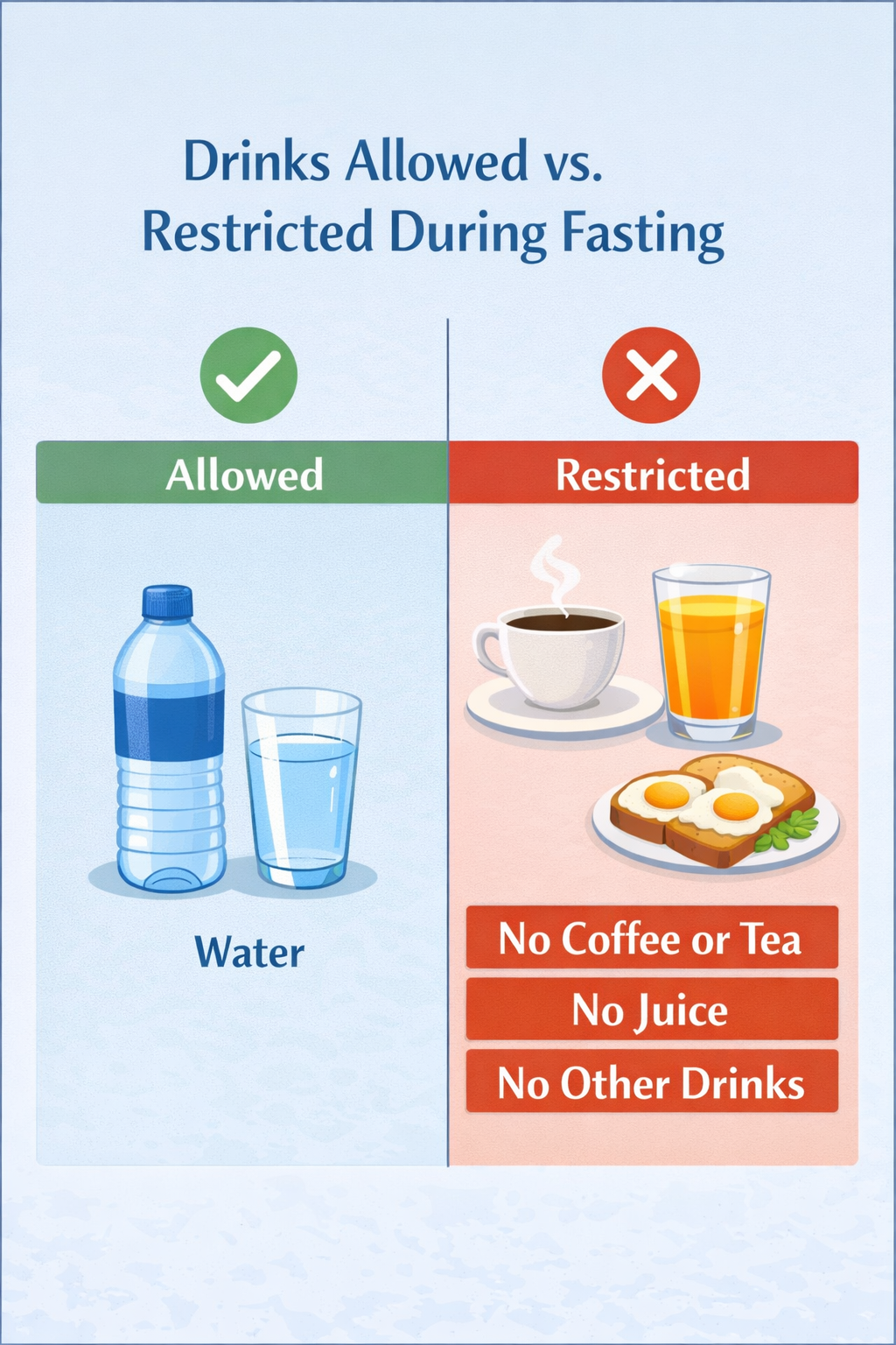 Patients frequently ask, do you drink water during fasting blood test? Yes—plain water is allowed and recommended. Water does not affect blood glucose or lipid levels and helps prevent dehydration, dizziness, and difficulty during sample collection. However, tea, coffee, milk, juice, or sweetened drinks must be avoided, as they can interfere with test values.