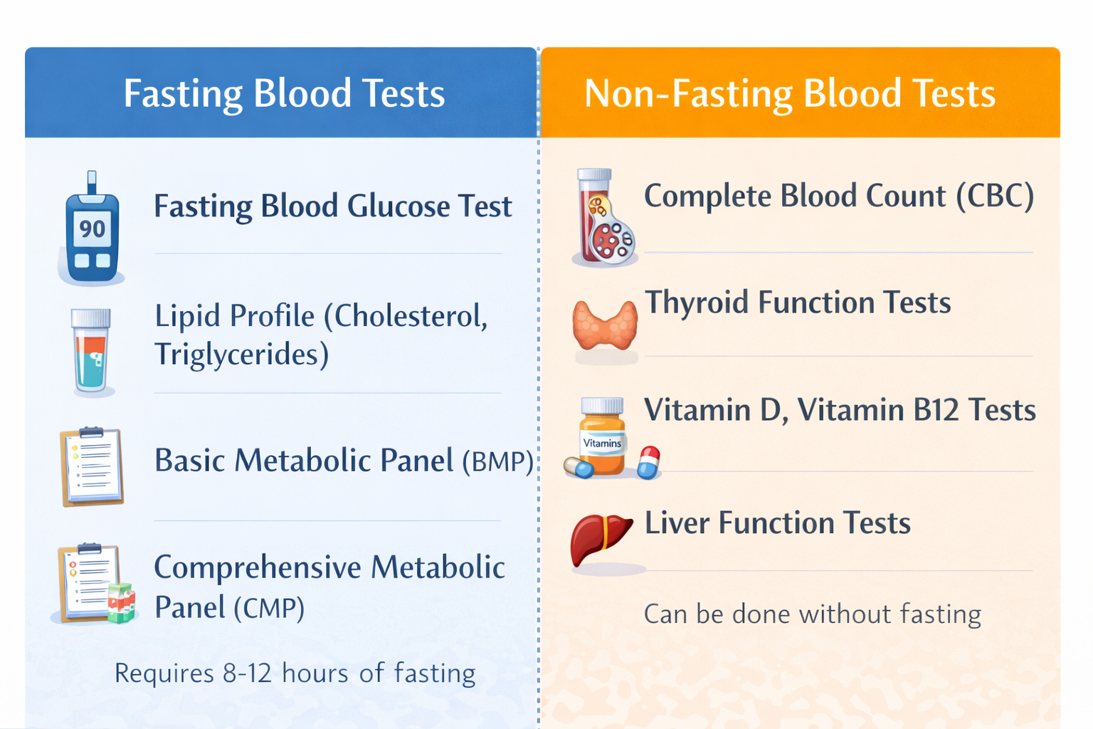 Tests that usually do not require fasting include complete blood count (CBC), thyroid function tests, vitamin D, vitamin B12, liver function tests (in many cases), and most hormone tests. However, doctors may still recommend fasting depending on the patient’s condition or if multiple tests are being done together.